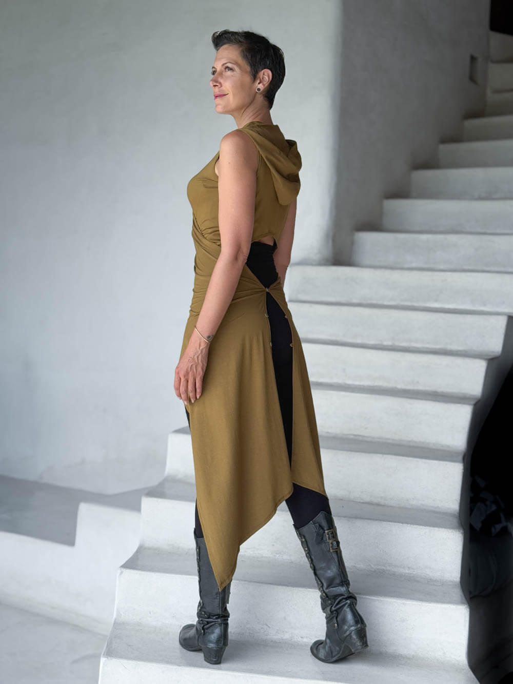 From bootie shorts to maxi skirts, this piece pairs with it all. The open back detail, hooded drape, and soft stretch jersey give it an edge that feels both elevated and easy.
